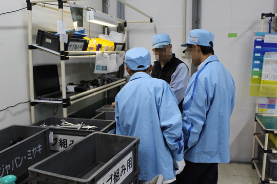 いよいよ実習に入ります。リーダーから作業の説明を受けます。慣れない立ち仕事は大変だと思いますが、がんばってください!
