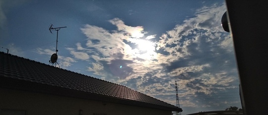 携帯で無理やり撮影していたら、レンズ越しの丸く反射した画像の中に月の様に日食が始まった太陽を撮影することが出来ました。