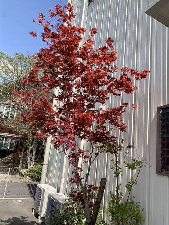 森町事業所の玄関横に植樹した木々も、春の陽気に誘われたかのように色づき始まました。