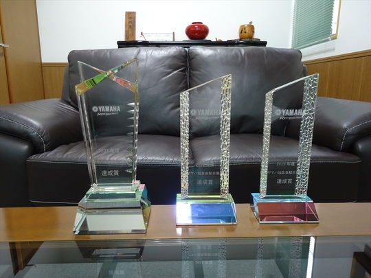 前年度に続き、ヤマハ発動機製品の販売に大きな貢献をすることができ、感謝状とトロフィーをいただきました。